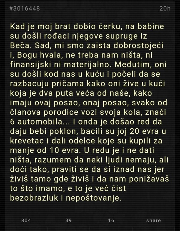 Međutim, rođaci su počeli da pričaju o svojim kućama, poslovima i automobilima, ističući koliko im je sve veće i bolje nego kod nas. Kada je došao red da poklone bebi, dali su joj 20 eura i nekoliko jeftinih stvari.